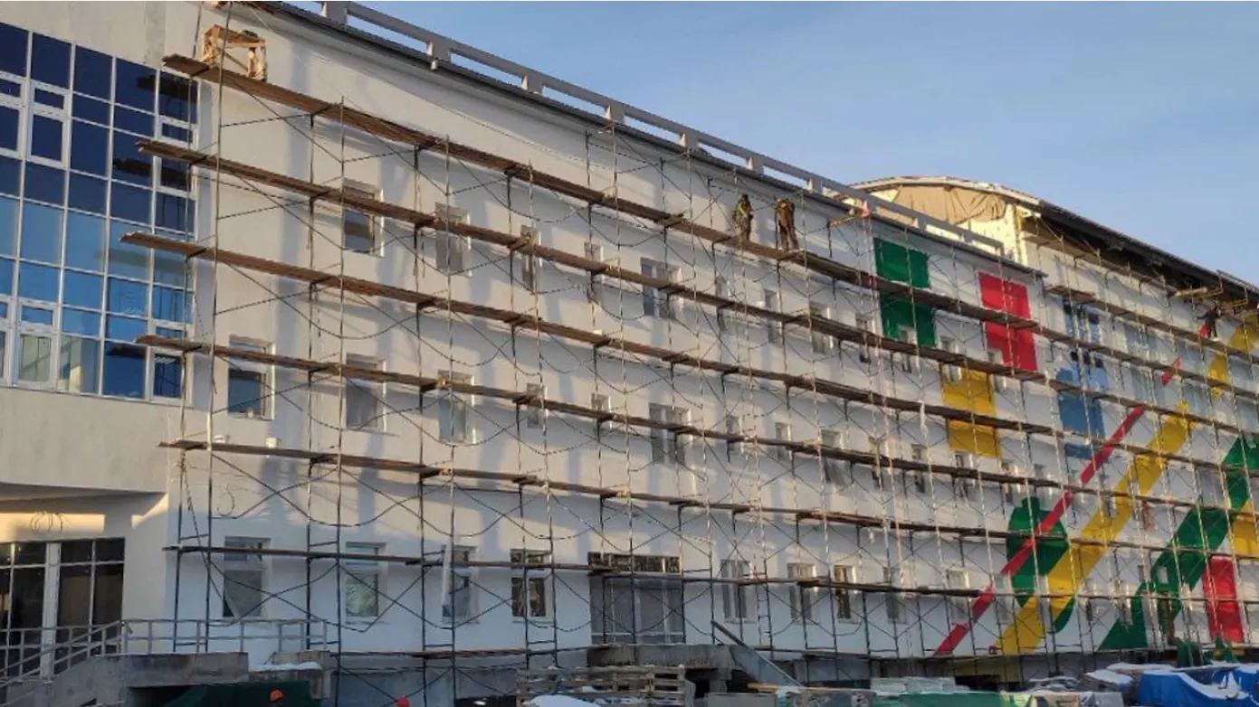 Строители перешли к внутренней отделке — проводят штукатурные работы. Площадь нового здания центра — 12 тысяч квадратов. Три этажа вместят в себя изостудию, хореографический, тренажерный и спортивный залы, бассейн.