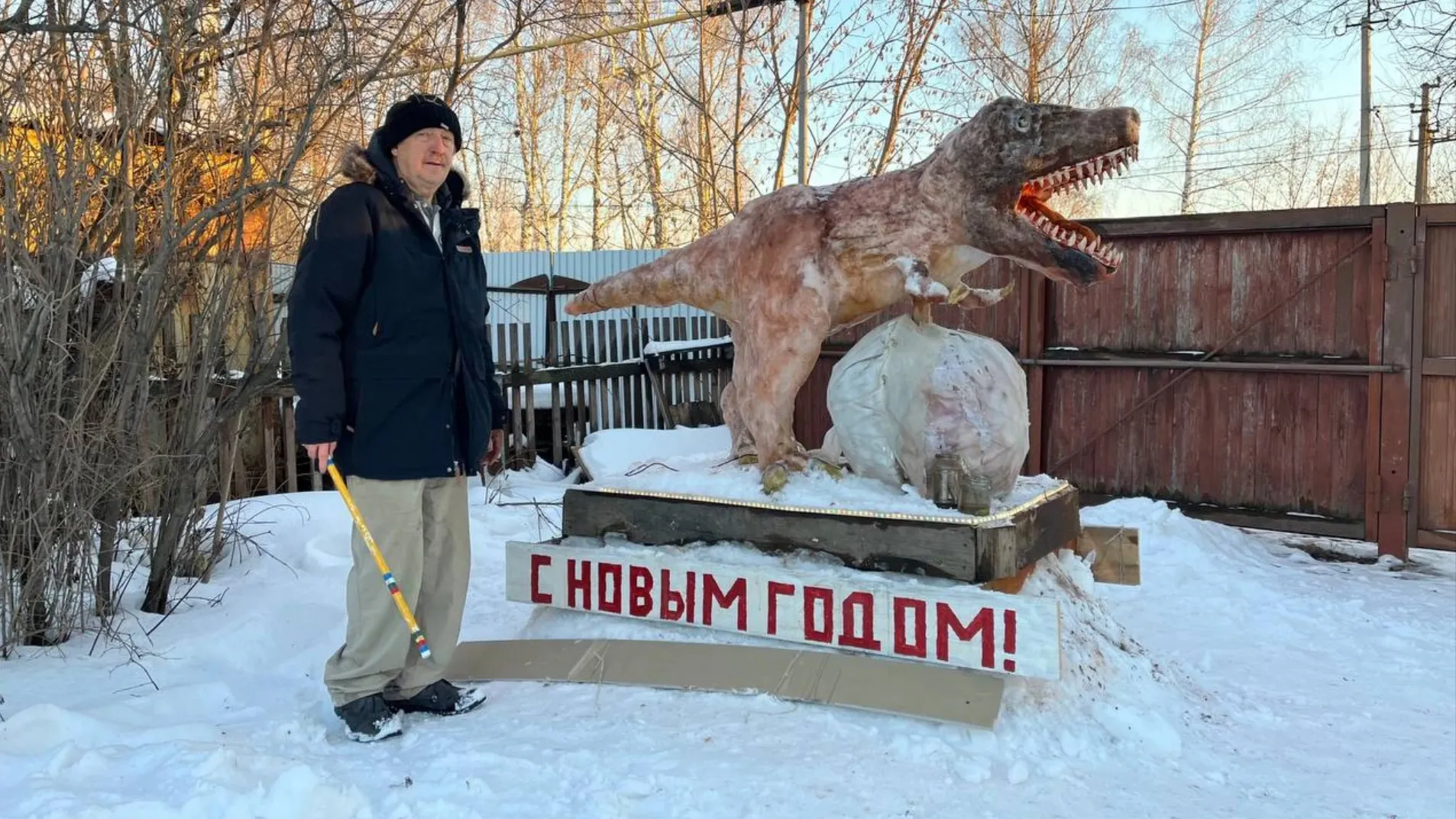 Новогодние праздники вместе с тюменцами отмечает гость из прошлого. На приусадебном участке год Дракона приветливым оскалом встречает динозавр Билл.